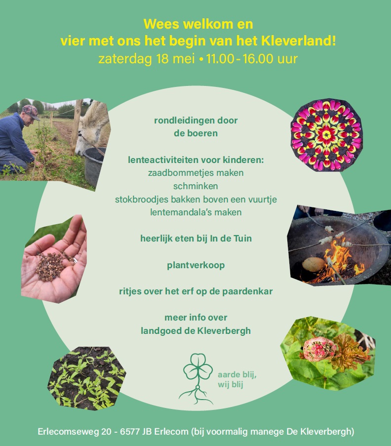 Op Landgoed Kleverbergh wordt Voedselgaard Het Kleverland ontwikkeld. Op zaterdag 18 mei kun je een kijkje komen nemen bij de open dag. Tijdens deze dag zijn er rondleidingen door de boeren van Het Kleverland, diverse kinderactiviteiten (zoals zaadbommetjes maken), kun je heerlijk biologisch eten bij In de Tuin, een rondrit met een paardenkar maken en worden er planten verkocht. Een kans op kennis te maken met de voedselgaard én het landgoed!
